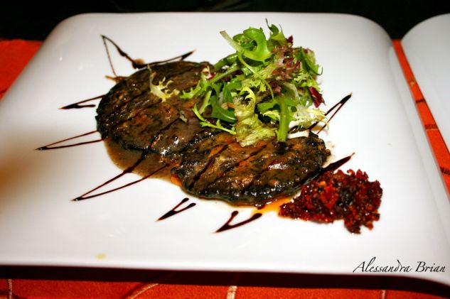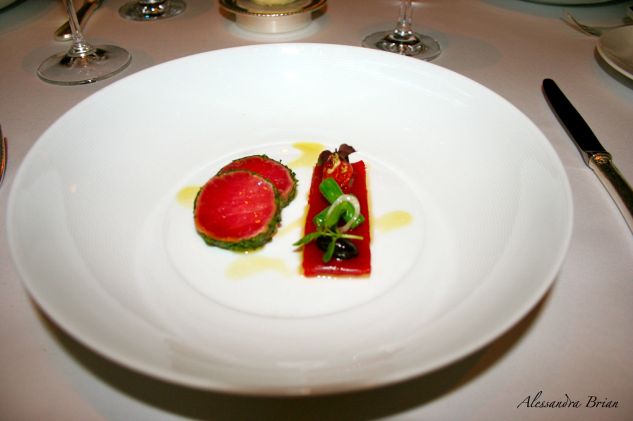 – Seared Tuna encrusted with Pink Peppercorns and served with Microsalad, Apricot, and Sweet Chili Sauce