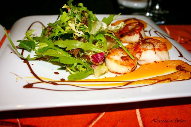 – Seared Scottish Scallops with Microsalad, Pumpkin Sauce, and a Chocolate Ribbon