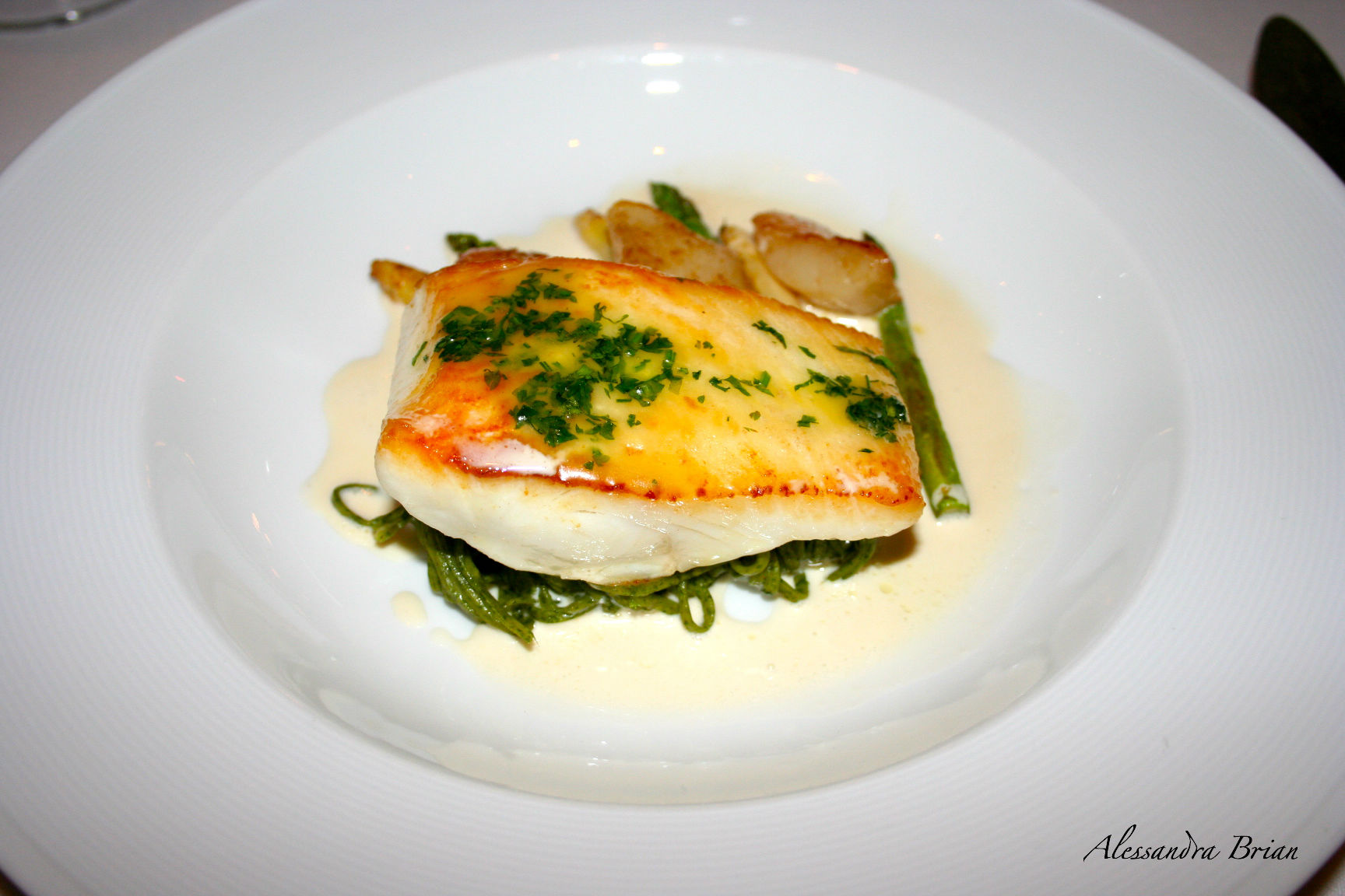 – Pan Fried, Line Caught Halibut, Seared Scallops, Coriander Linguini, Roasted Asparagus, and Lemongrass Veloute