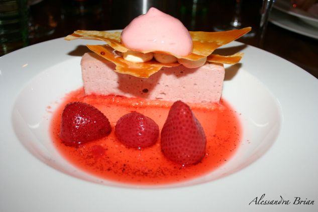 Poached Strawberries with Strawberry Parfait, Vanilla Mousse, and Caramelised Pastry