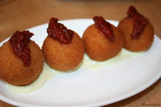 Fried Mashed Potatoes Filled with Cerano Ham topped with Tomato Sauce & Garlic Aioli