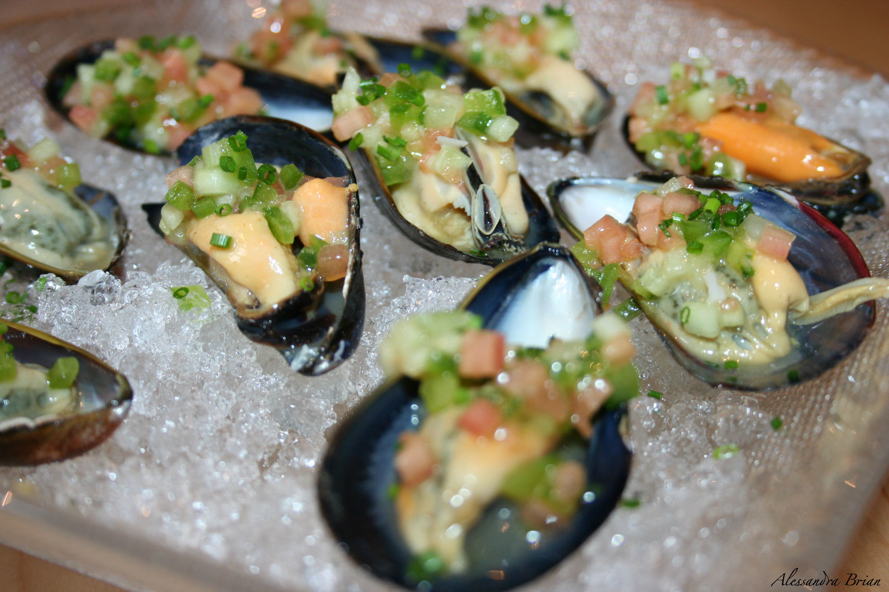 Mussels served with Pipirrana, Sherry Dressing, and Honey