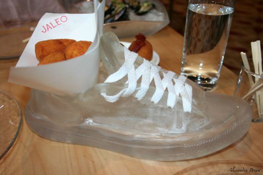 I flagged a waiter down to take a picture of the most oddly presented Chicken Fritters, served in a glass shoe!