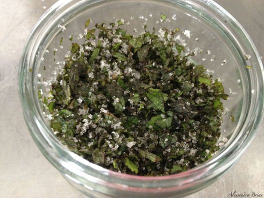 4. Finely chop fresh mint leaves and mash together with sugar with a mortar and pestle. A spoon and bowl works just fine if you can’t find your mortar and pestle, like me.