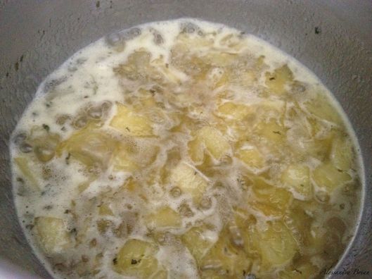 3. I wanted the sauce to be slightly creamy, but still maintain the juiciness of the pineapple, so I decided to make my sauce a full fat situation. If you want, you can stop here and have a perfectly yummy sauce. But, I don’t think you want to. Stir in coconut milk and double cream and remove from heat.