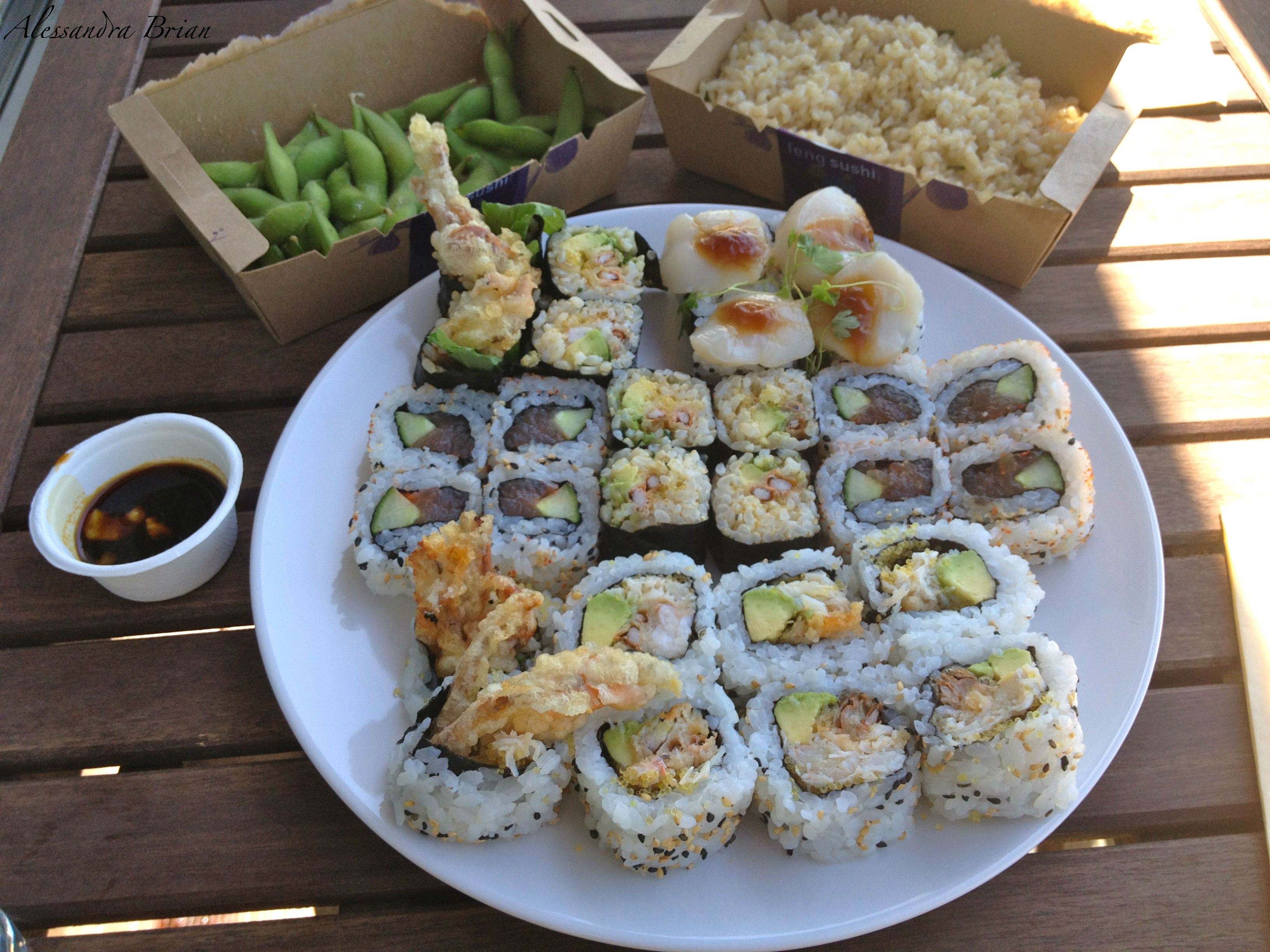 Feng Sushi al Fresco on the balcony with blue skies and the sun shining. Fact: Sushi tastes better served with sunshine