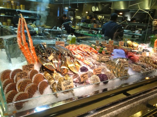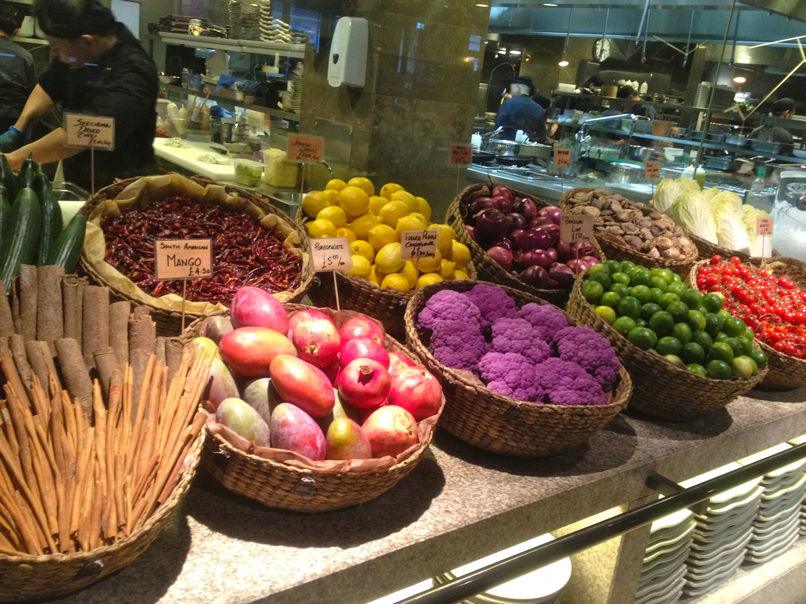 Then we wandered through the “Market Place” in the Asian Dining Room which had beautiful vegetables, spices, and seafood displayed in front of the kitchen.