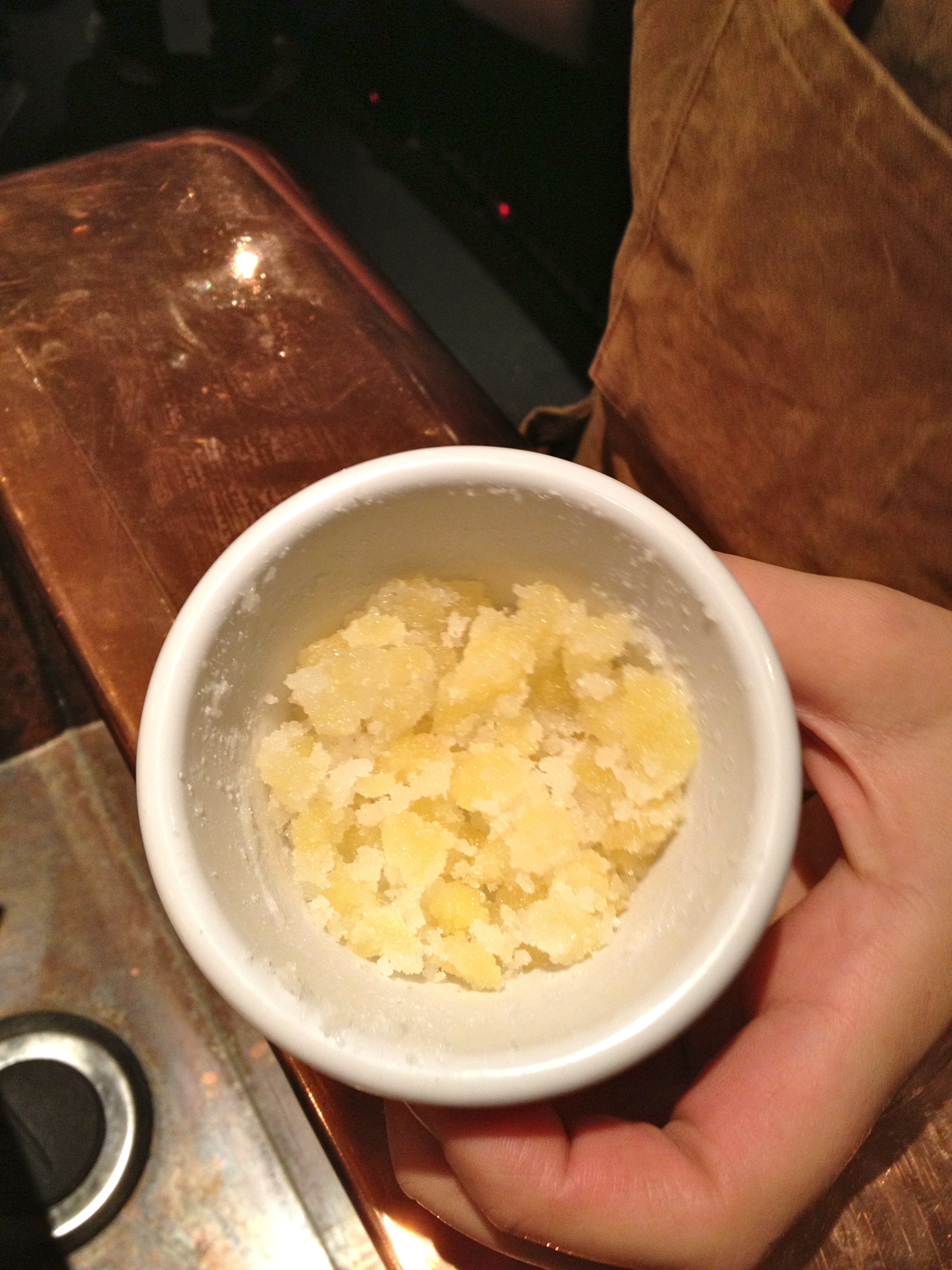 Luckily I hadn’t seen my Bubbledog dates for quite some time and we had plenty to catch up on. The apologetic hostess eventually seated us at the corner of the bar, which wasn’t particularly comfortable, but resulted in sampling the bartender’s yummy creation of candied ginger for her new cocktail.