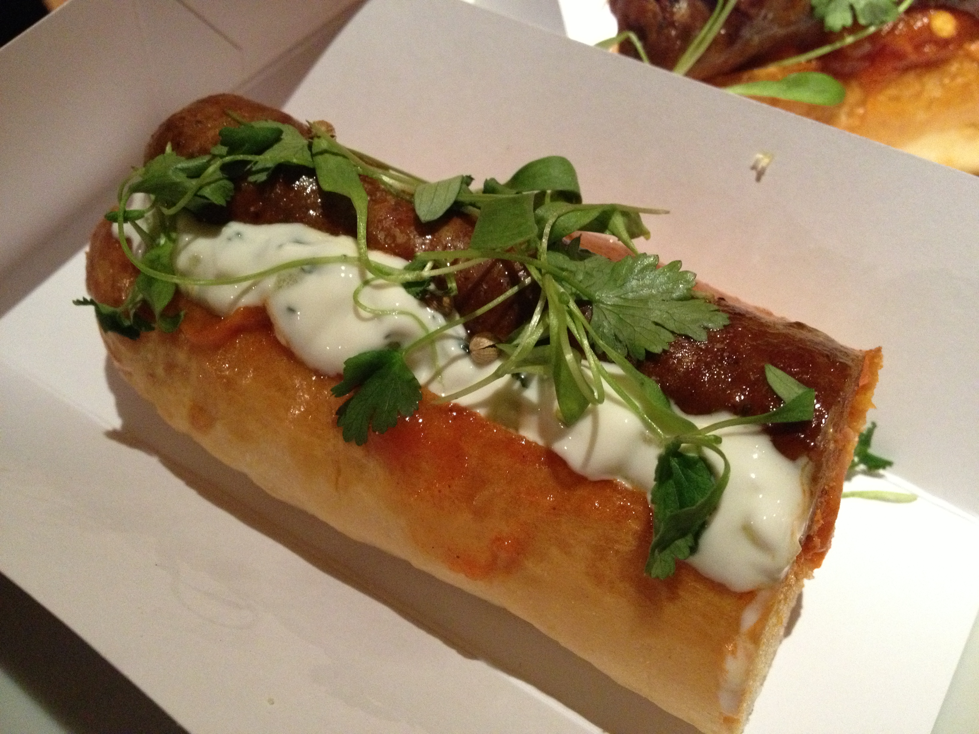 We quickly decided that this was going to be a filthy celebration of maximum caloric intake. A mandatory order of the Tunisienne Hot Dog was made. A spicy lamb merguez served on a brioche bun with mint yoghurt and pepper stew.