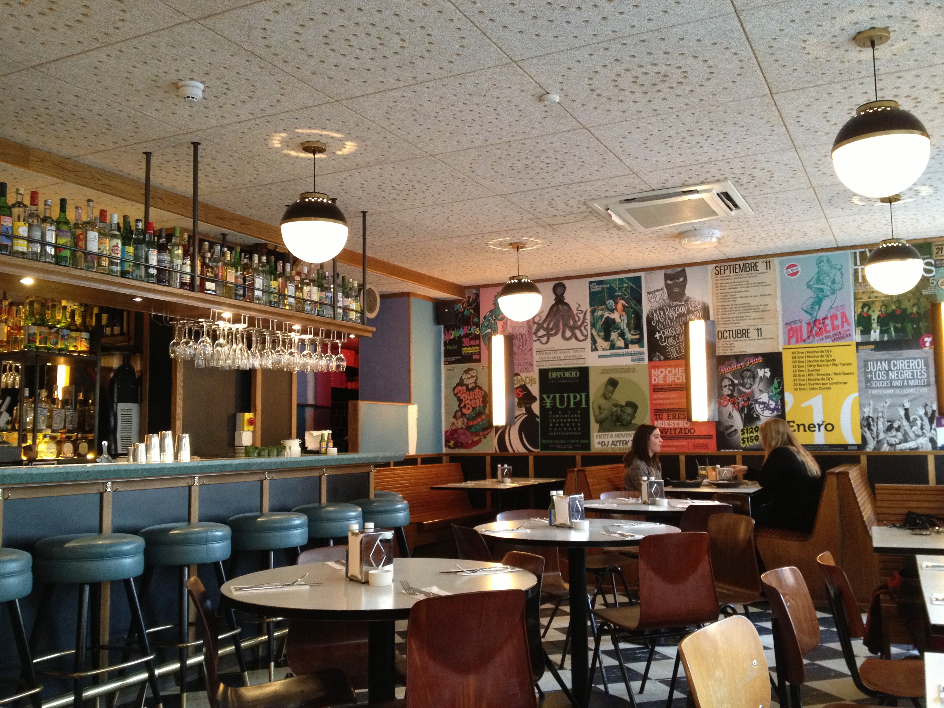 Spanish music posters line the wall and the room has a retro diner feel to it with checkered floors, wooden chairs and exposed lights.
