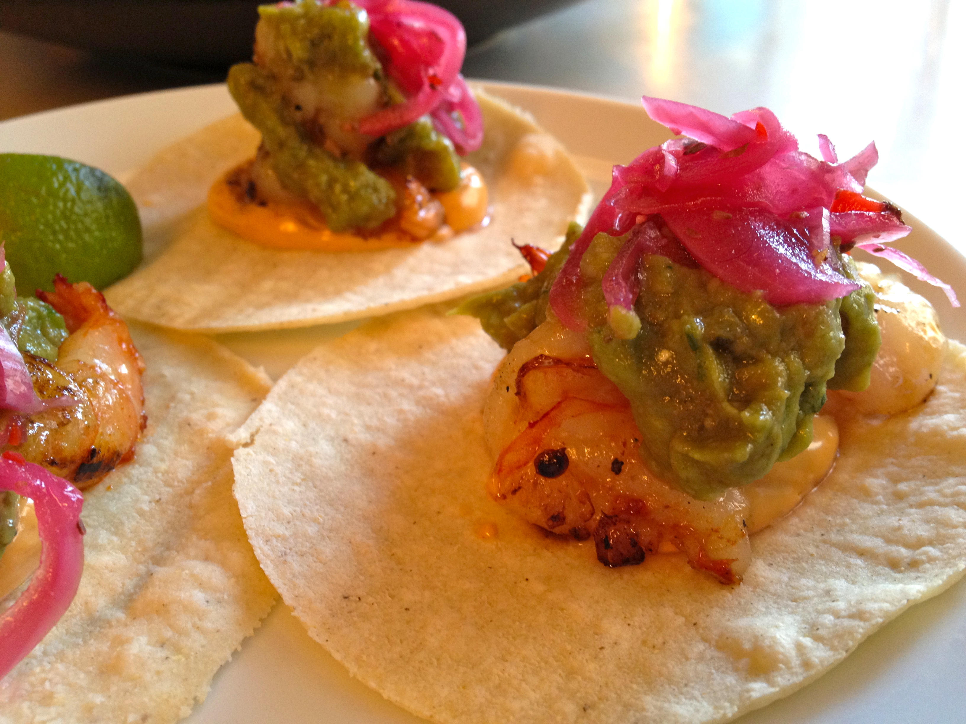 On the menu, there’s a great selection of typical tacos, quesadillas and ceviches. I ordered Pork Belly Carnitas with Salsa Verde Tacos and Camaron (shrimp) Tacos with Chipotle Cream and Pickled Onion with a side of Green Rice and Cowboy Beans.