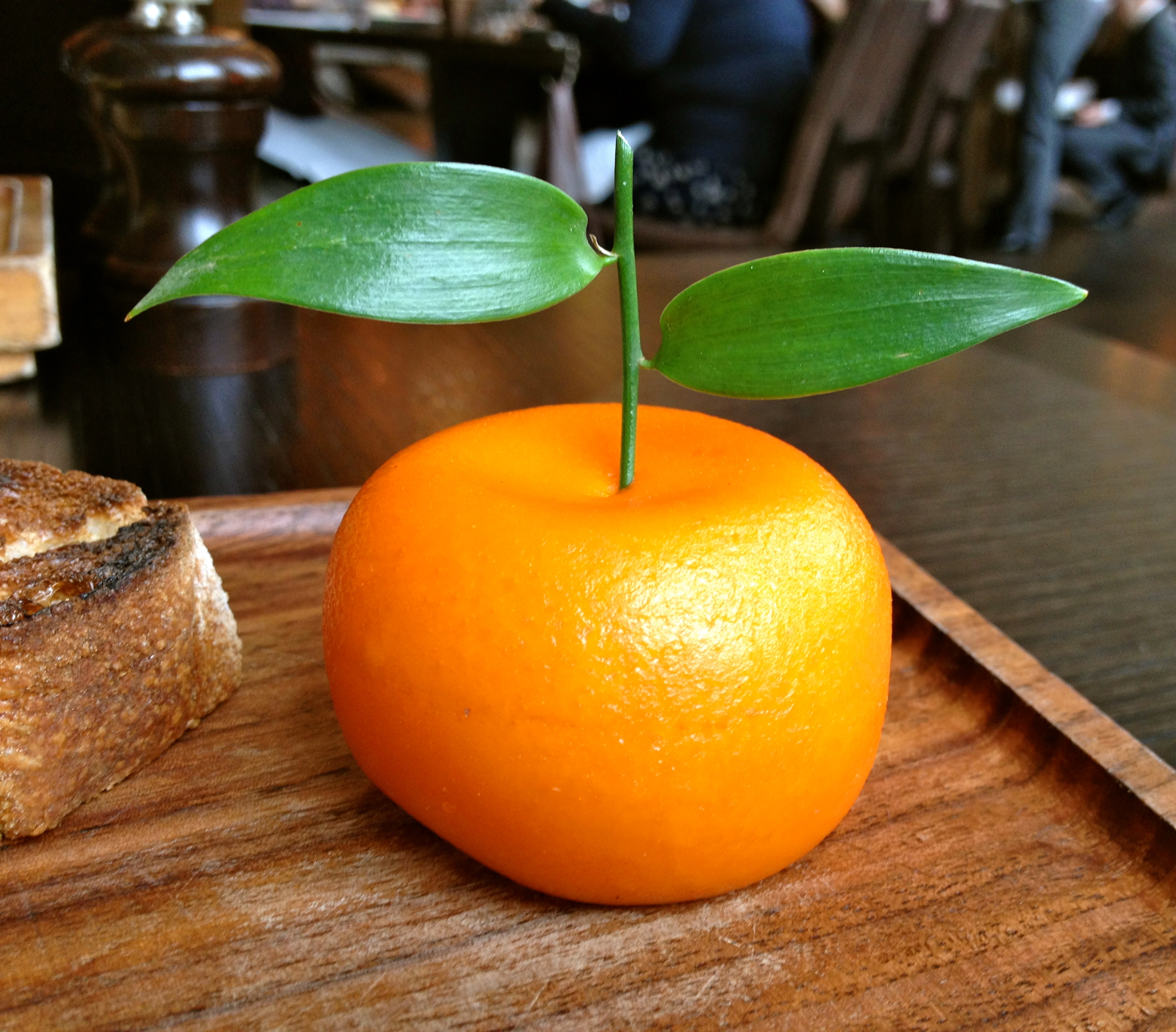 A perfect sphere, imitating a mandarin with a shiny, dimpled peel and green stem. The motivation behind this dish dating back to the c.1500 is from the old English habit of making one food appear as another.