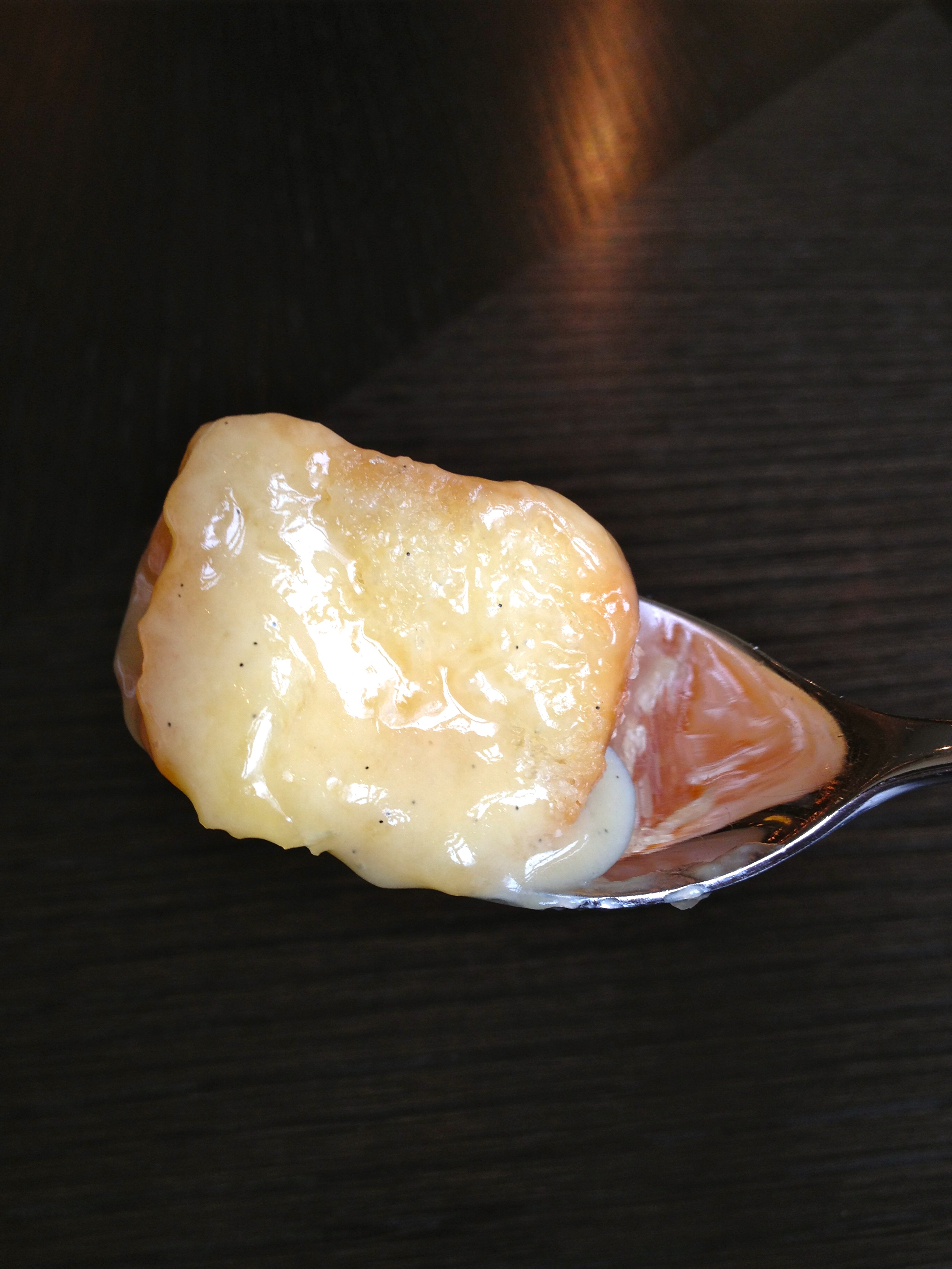 The sweet bites are accompanied with spit roasted pineapple which creates a caramelised exterior and a sharp but sweet fruity centre. This cuts the sweetness of the brioche, but still allows a warm, fuzzy feeling.