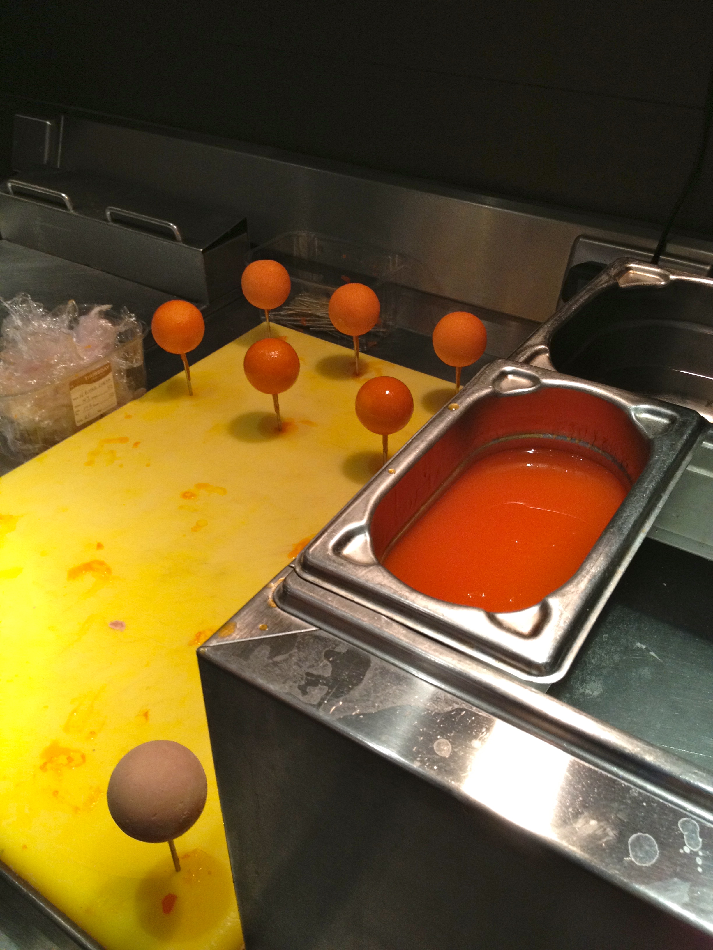 Here, the frozen spheres of chicken liver & foie gras parfait are dipped into a mandarin gelatine which solidifies instantly from the cold.