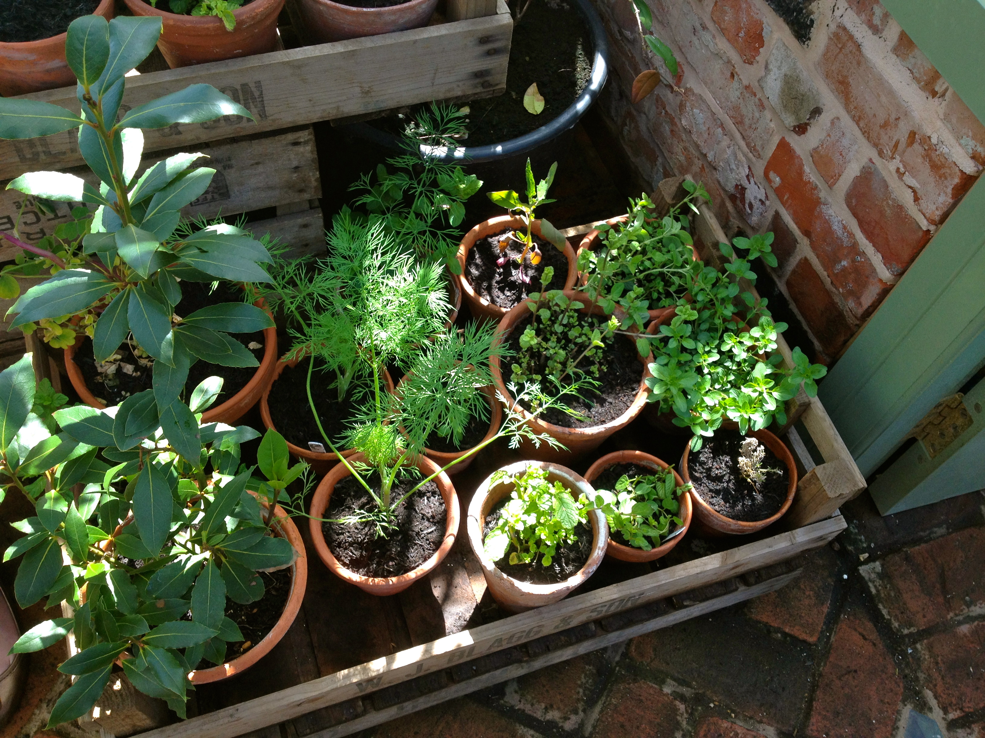 Tucked into the back of the garden was a beautiful sage coloured greenhouse. Inside was an incredible assortment of herbs all in little, individual pots and trays.
