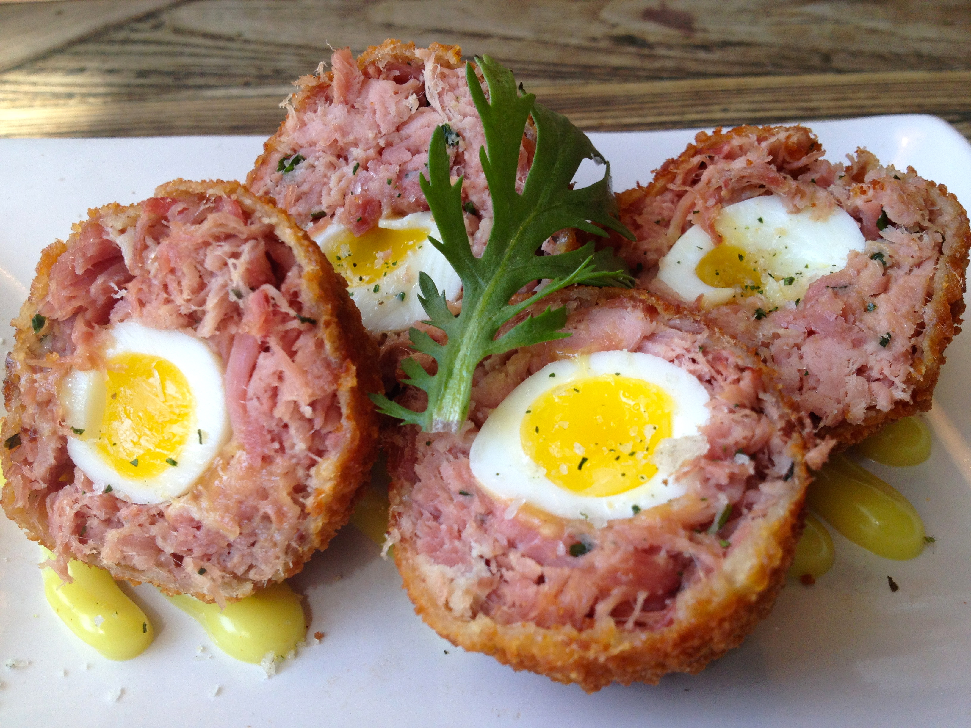 First to try, the most delectable scotch eggs with perfectly cooked quails eggs nestled inside tender pork.