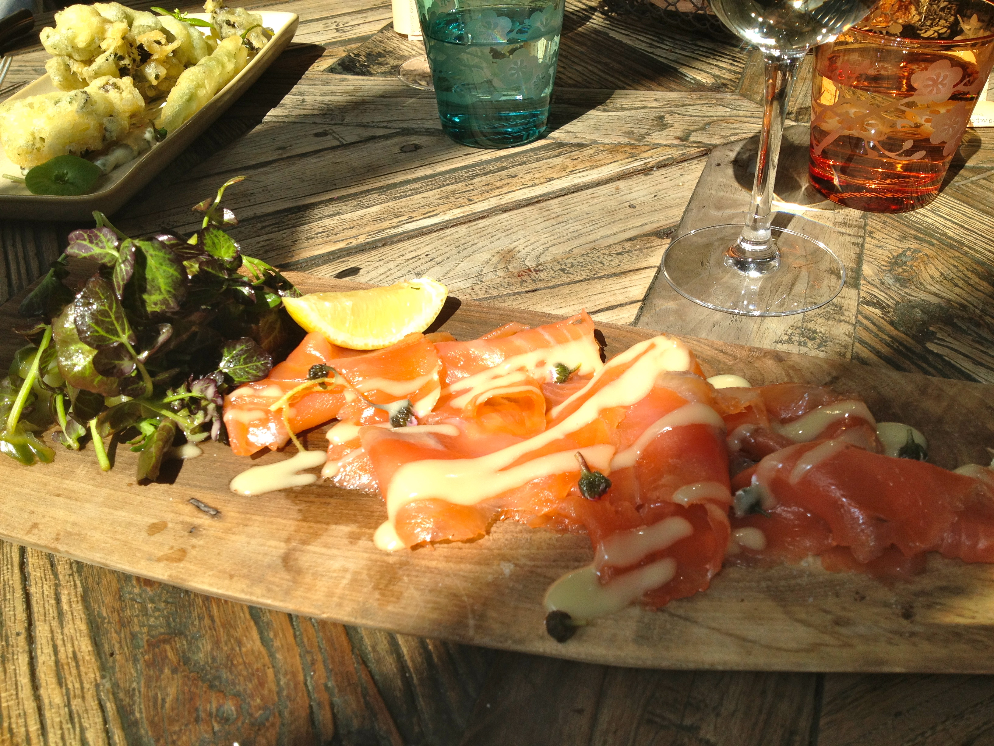 Then a sample of smoked salmon which had previously been smoked just outside in the smoke house. The salmon was delicious. Smokey flavours paired with a sweet honey mustard sauce and topped with the acidity of the lemon made for a delightful mouthful. The fish was garnished with edible flowers and paired with a pile of fresh leaves and pickled cucumber.