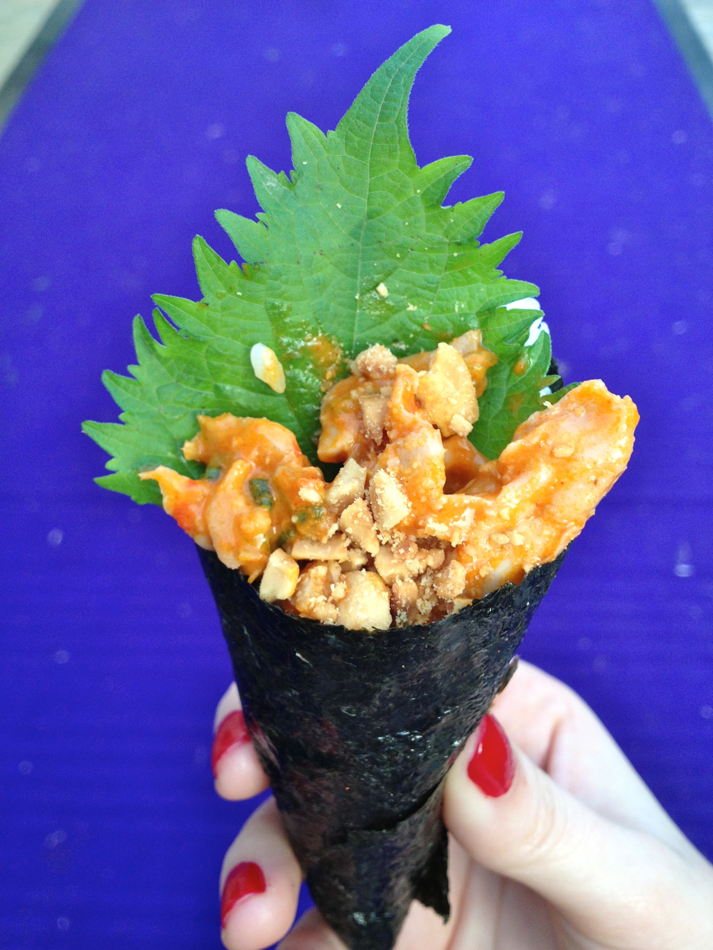 The wrap looked invitingly easy to eat and with a name like Bang Bang Spicy Chicken Hand Roll, I had to give it a try. Although it was strange to have chicken in a hand roll where traditionally fish would be present, the flavours worked surprisingly well and it was quite good overall.