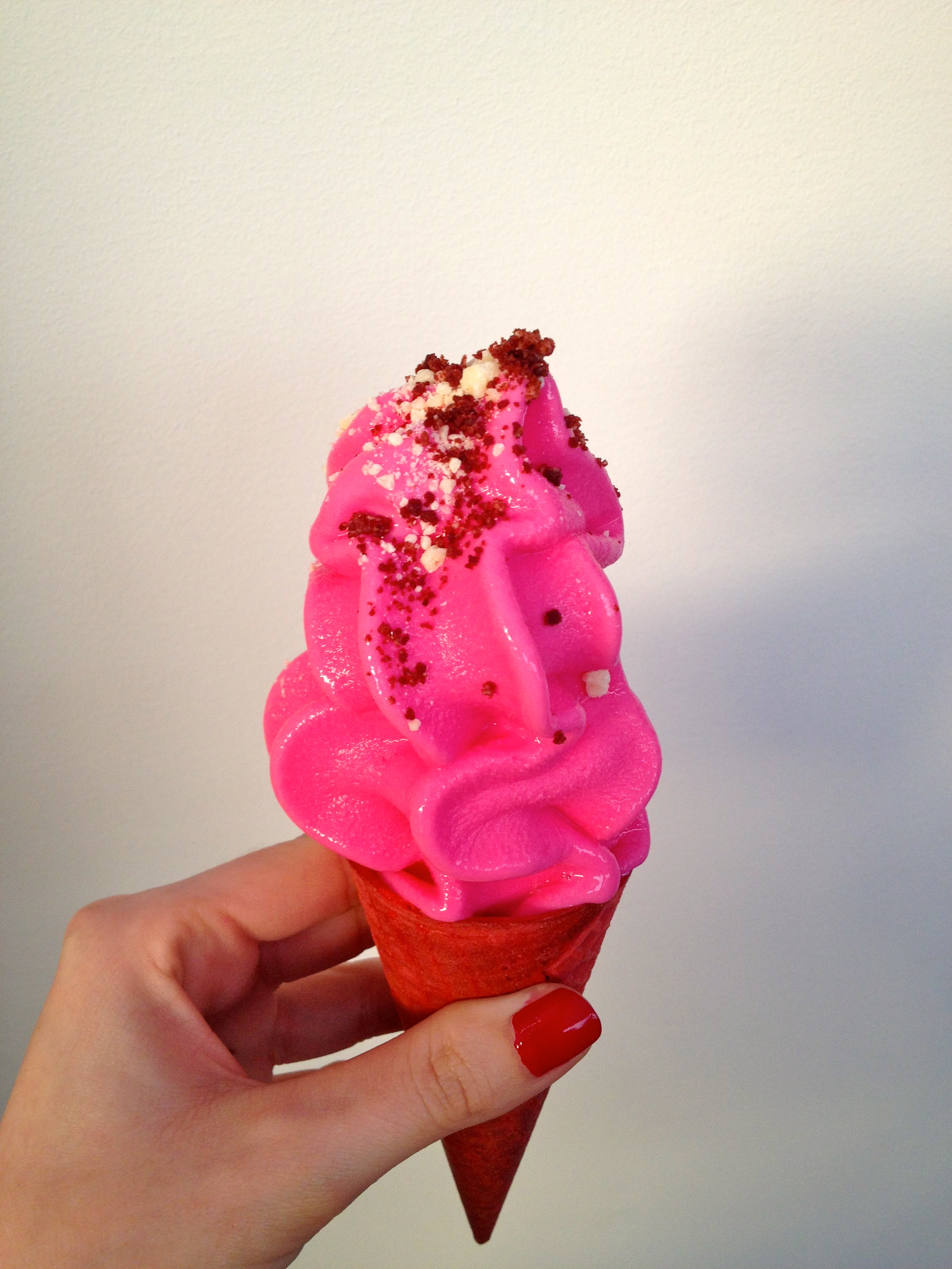 The “Red Whippy” red velvet ice cream comes out hot pink, is swirled into a waffle cone and topped with crumbs of red velvet cake and white chocolate.