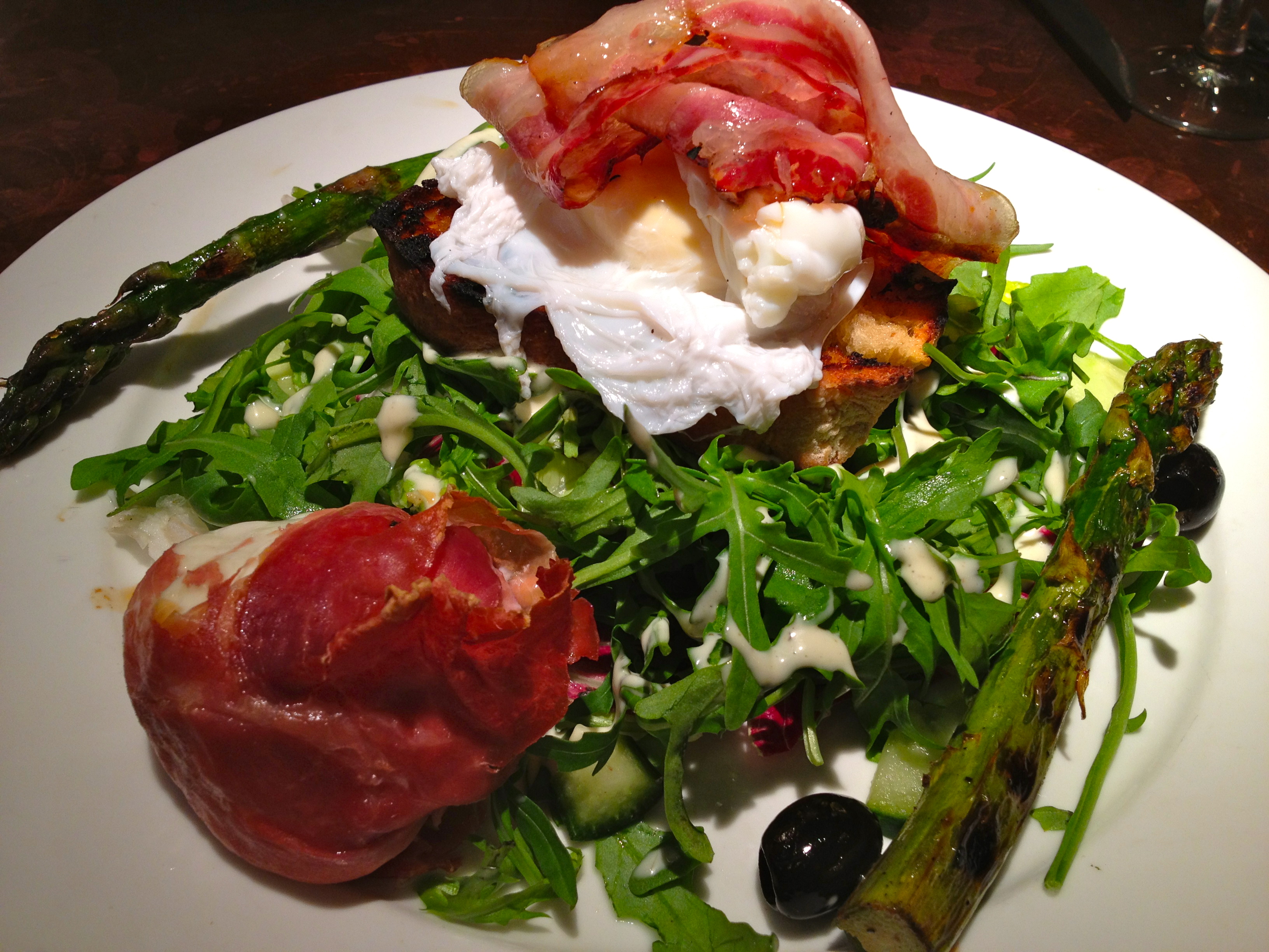 An asparagus and poached egg salad with baked sourdough topped with melted mozzarella, pancetta, baked mozzarella wrapped with San Daniele, mixed leaves and house dressing was a naughty but delicious combination.