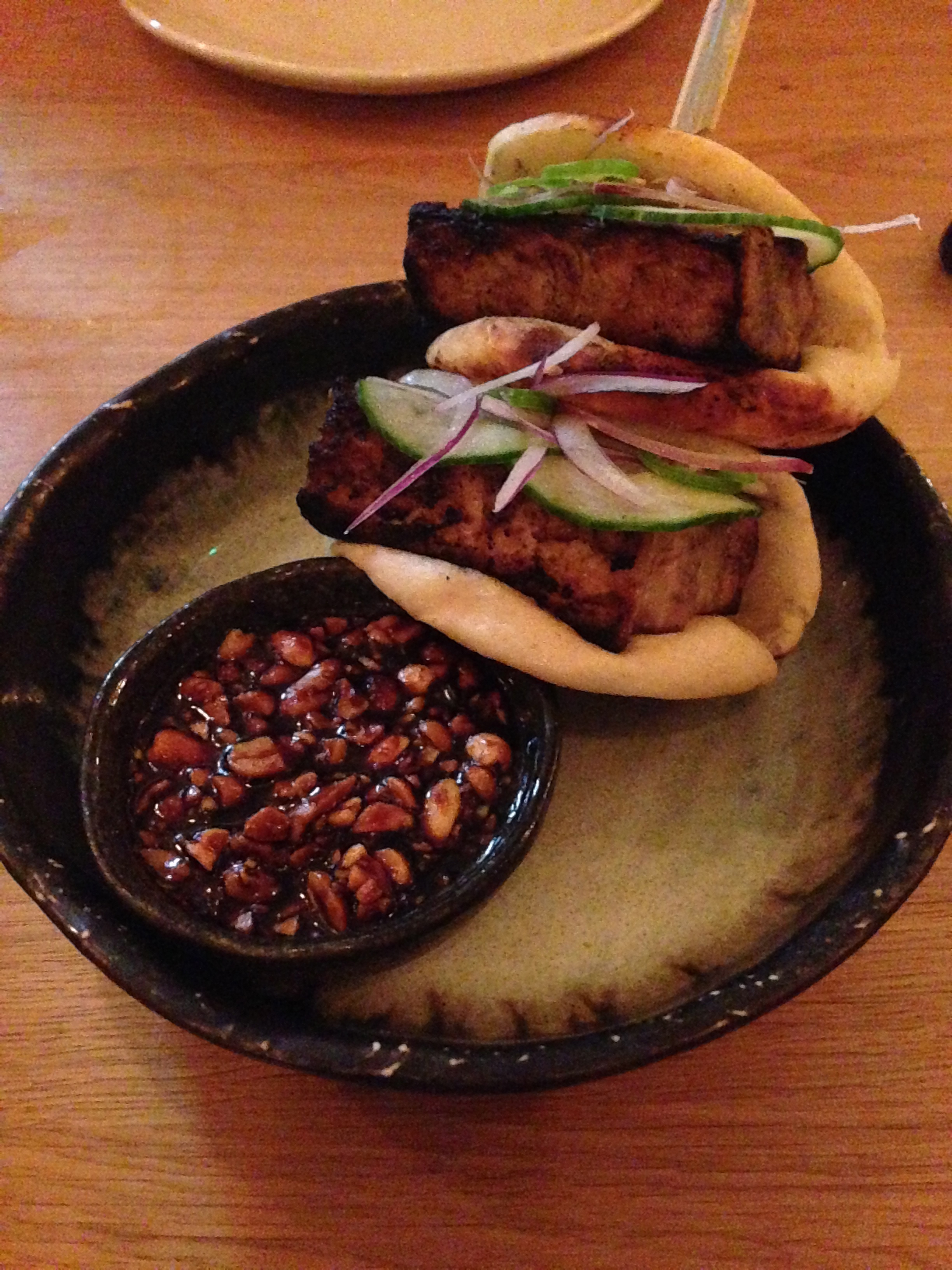 BBQ pork belly in steamed buns arrived with with a spicy peanut soy sauce, which I generously slathered on each bite.