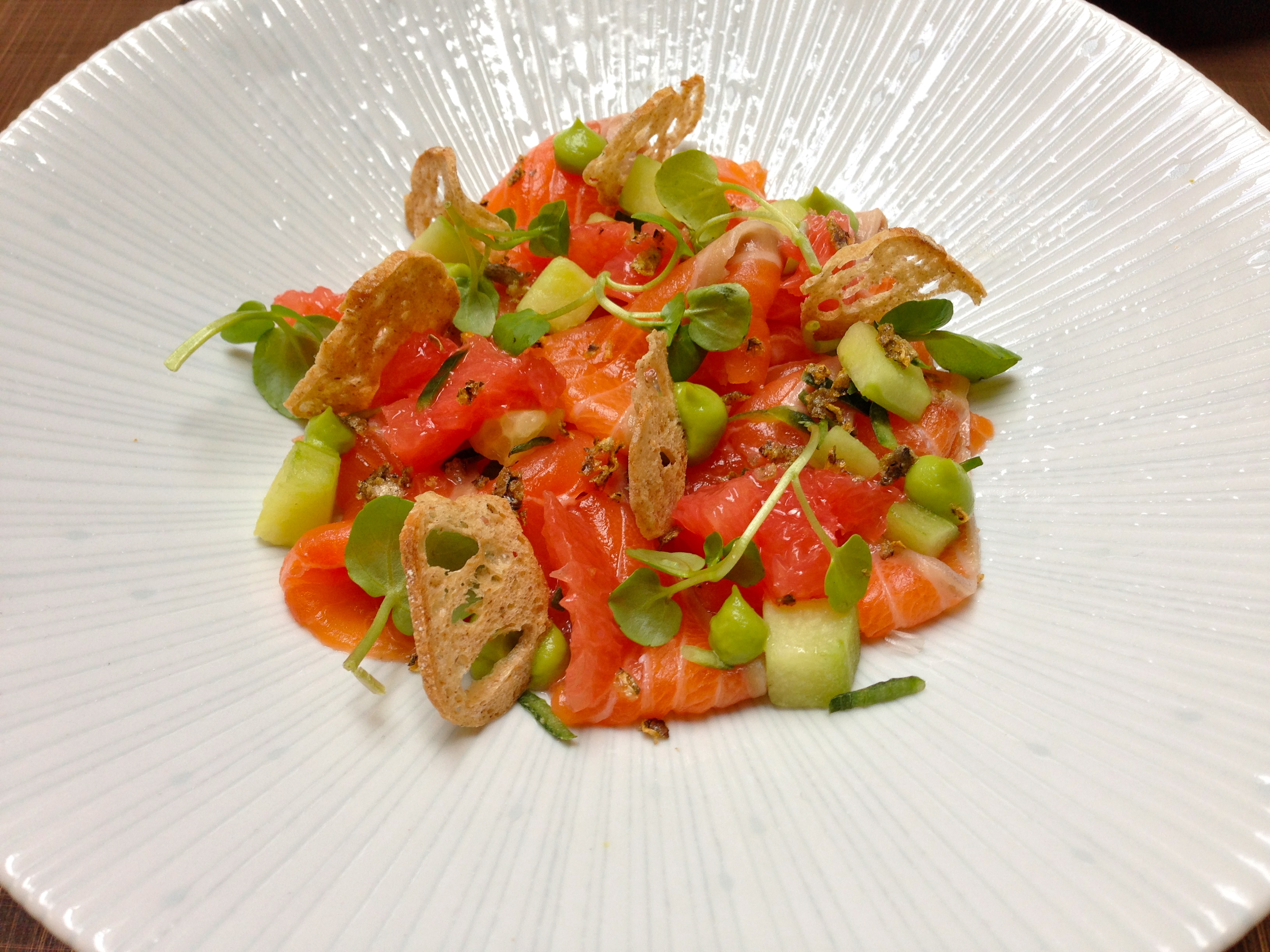 Lightly cured Scottish salmon, cucumber, sea lettuce, creme fraiche