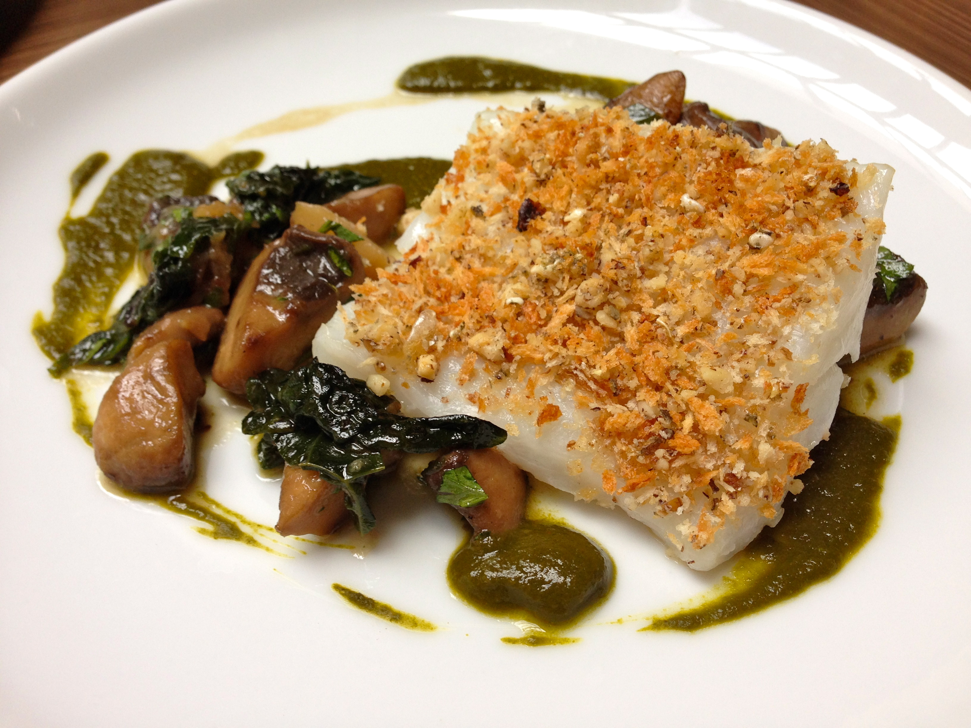 Grilled cod, Jerusalem artichoke, chestnut mushroom, cavolo nero