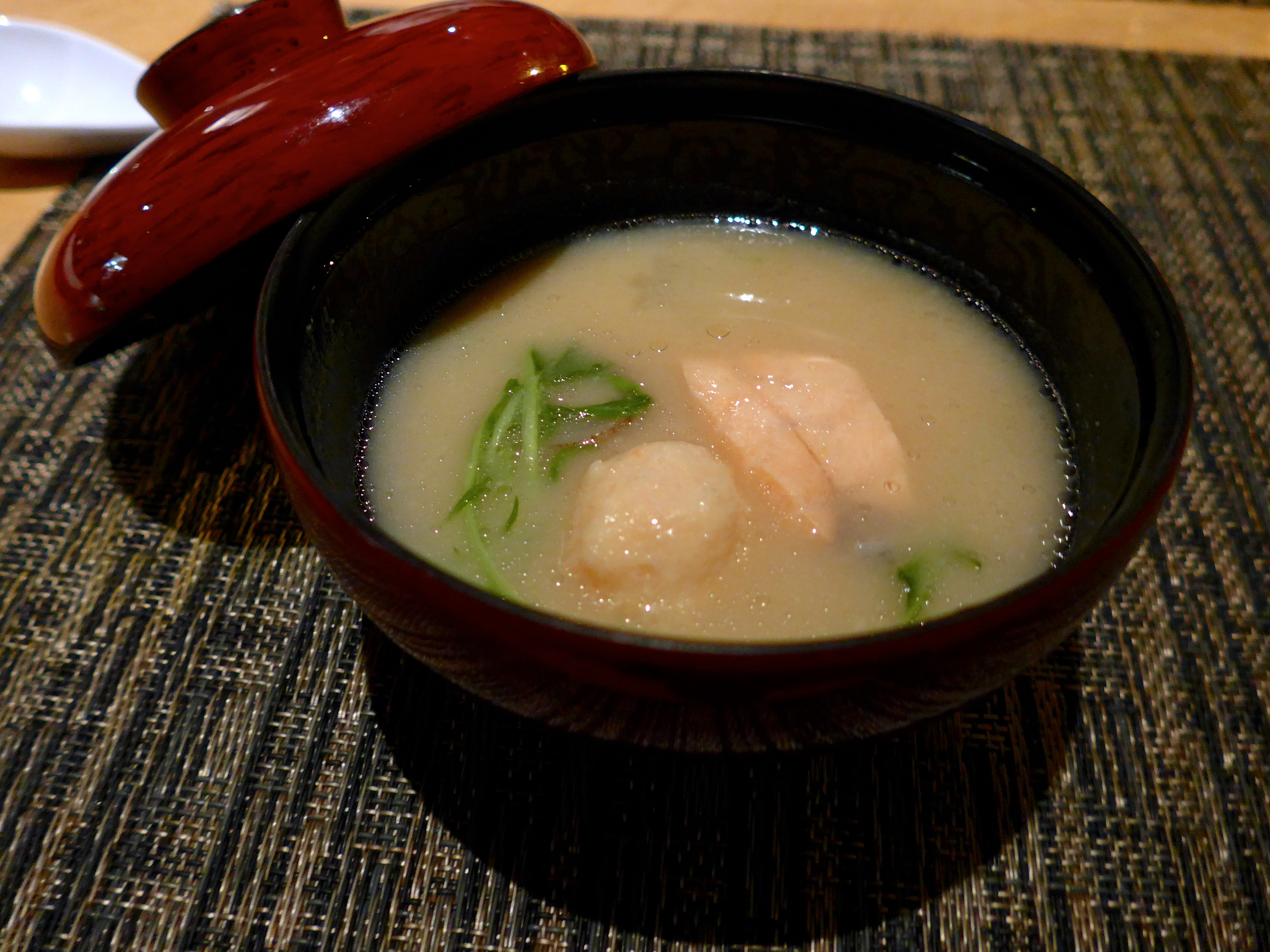 Followed by a little red pot, which revealed Spanish mackerel, kasu-jiru sake lees soup.
