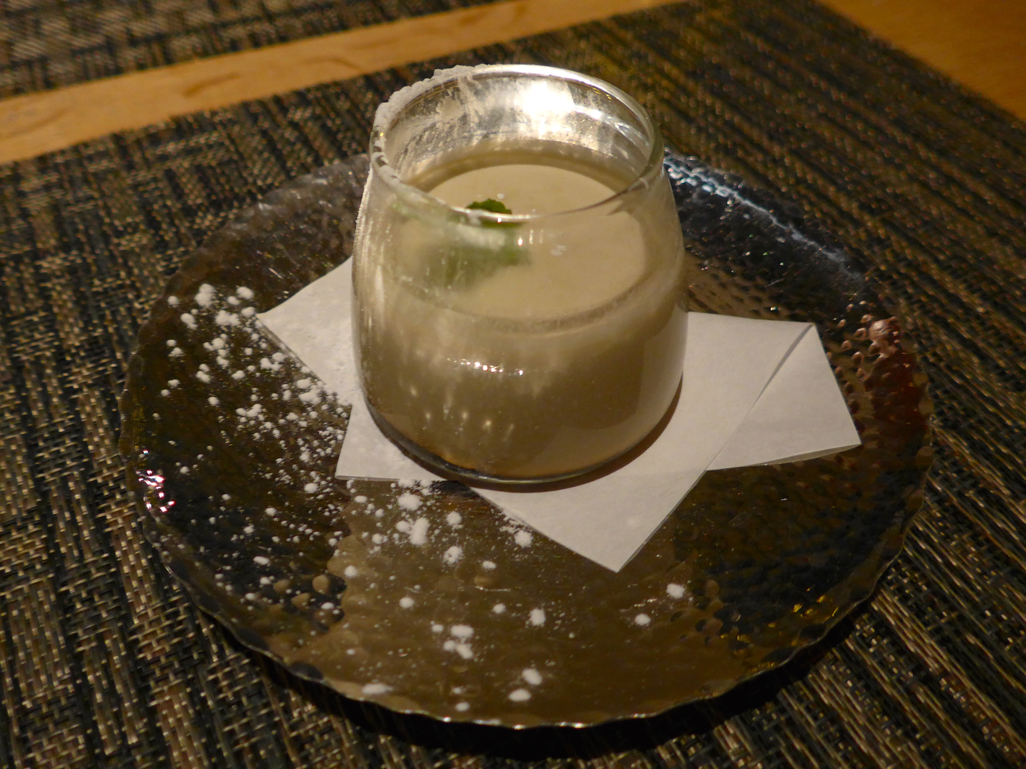 The evening started off with a sip of Champagne with yuzu and chrysanthemum. I kindly donated mine, but it looked beautiful and smelled citrusy.