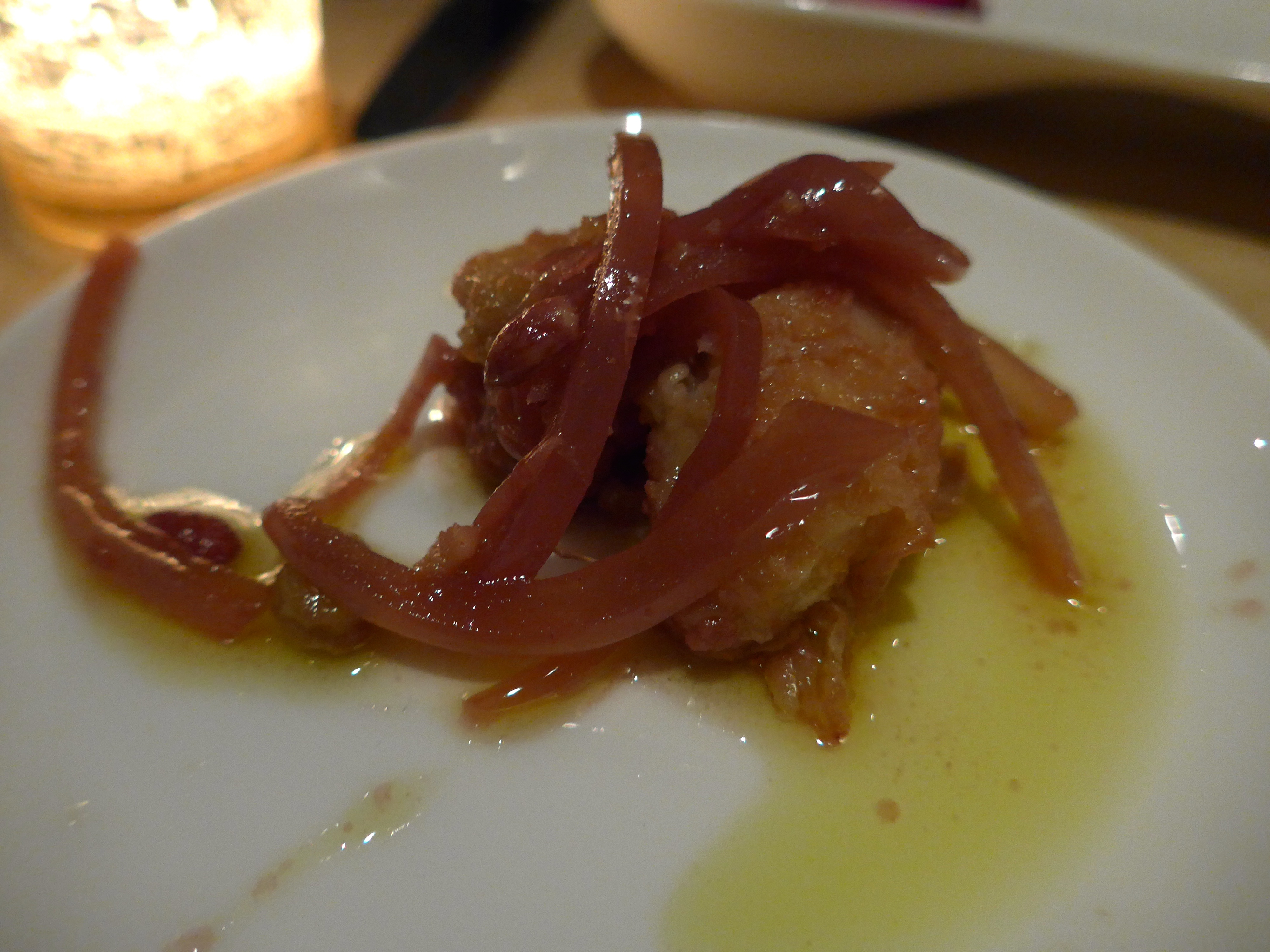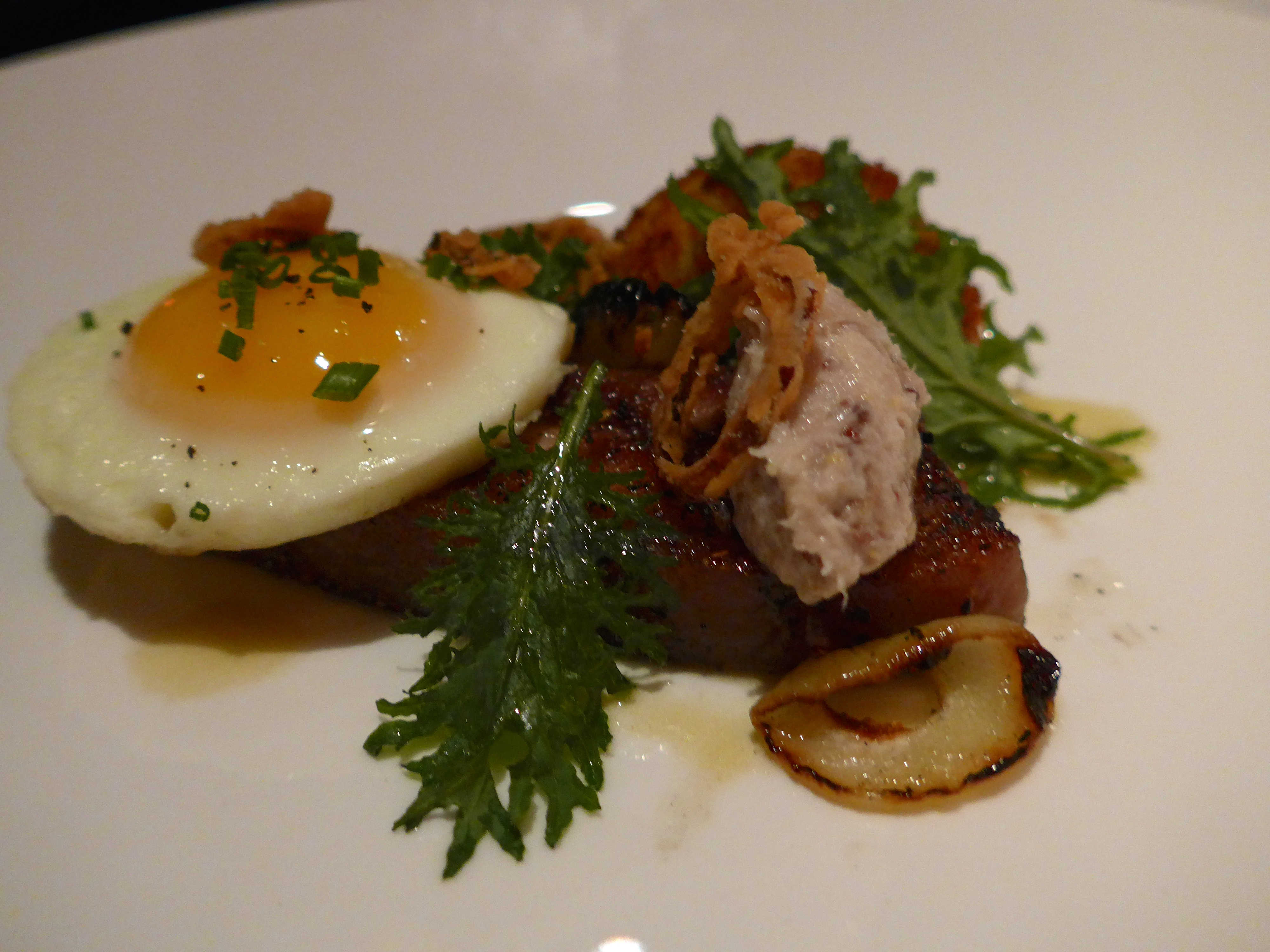 Followed by grilled Berkshire pork belly with charred onion, potato fritter and dippy egg.