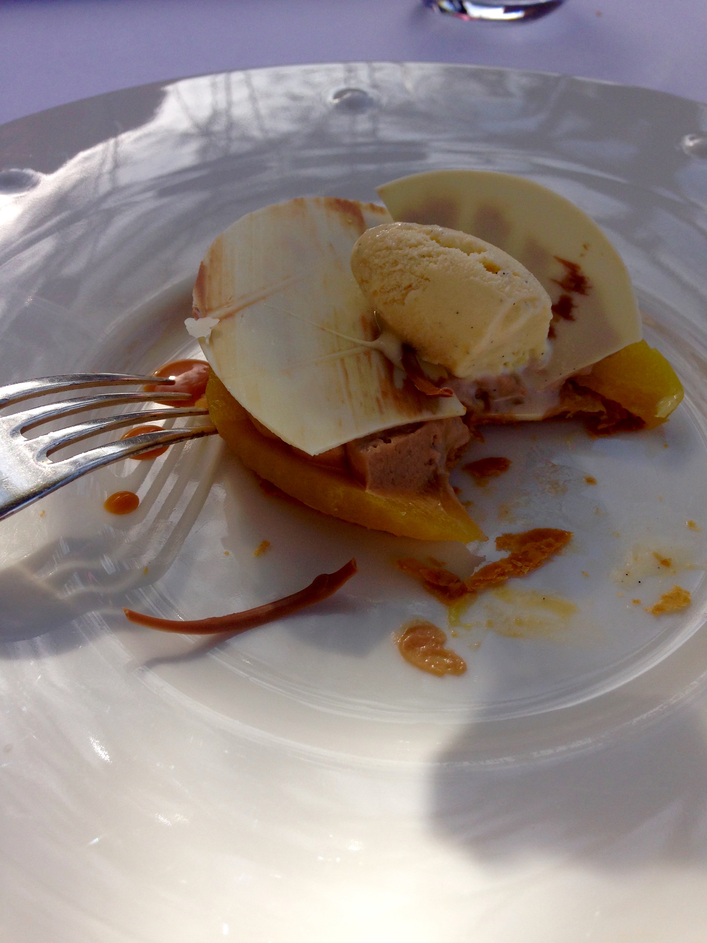 A surprise soon emerged from the kitchen – a pear and chocolate tart topped with a white chocolate disk for a satisfying crunch.