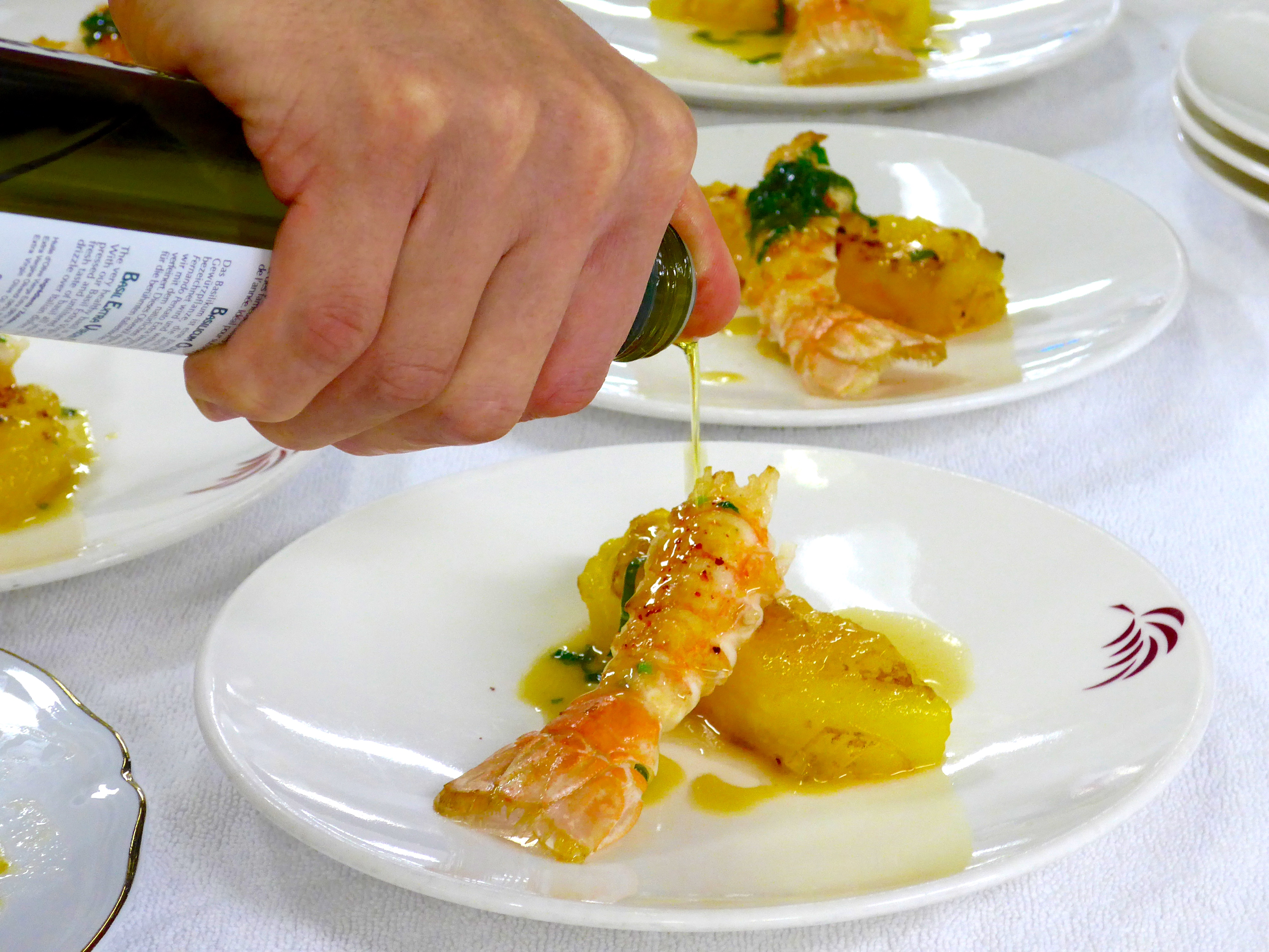 A meaty beef tomato was paired with a langoustine and topped with basil oil.